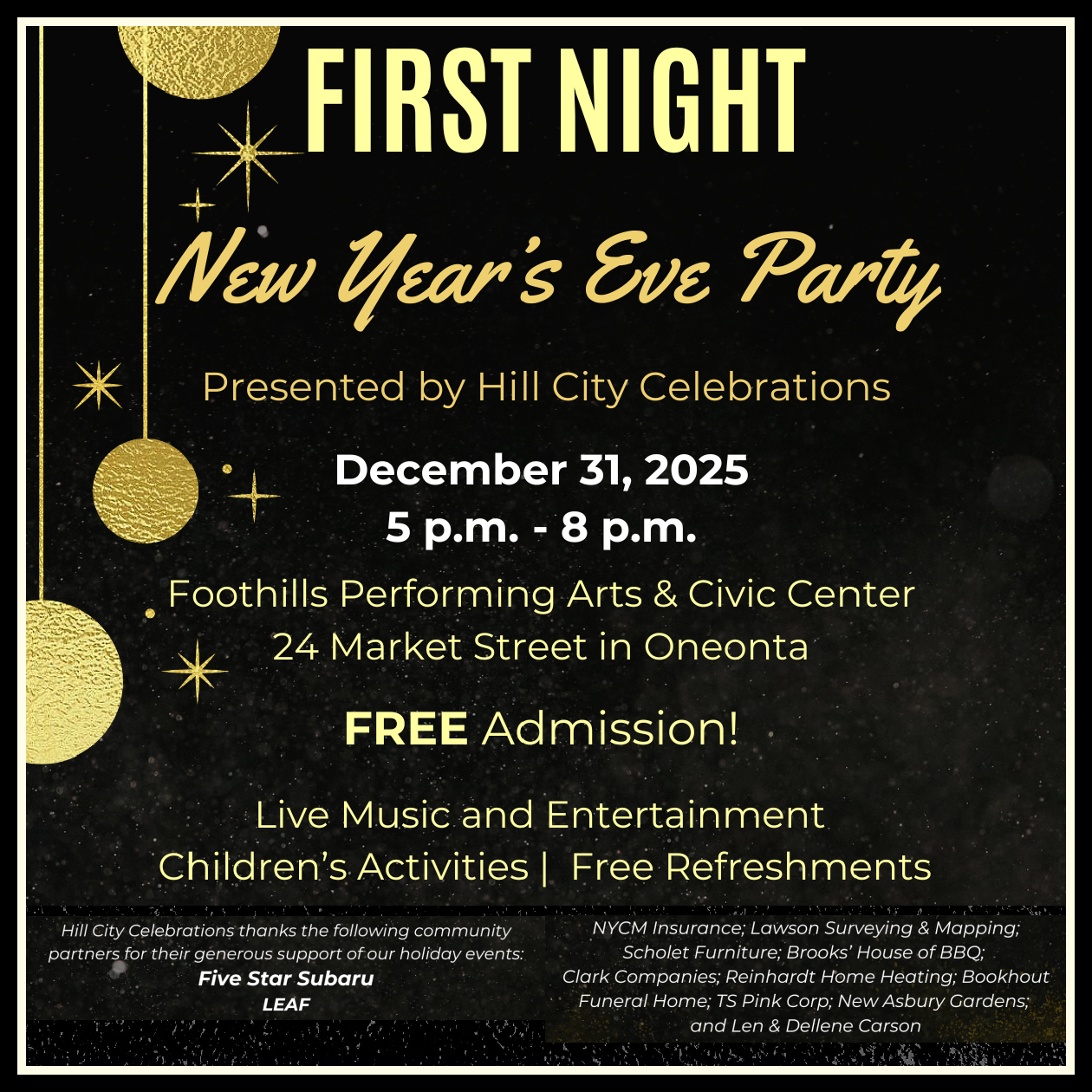 Hill City Celebrations is bringing back Oneonta’s most beloved First Night New Year’s Eve celebration at the Foothills Performing Arts & Civic Center, offering free entertainment and refreshments for the whole family from 5 p.m. to 8 p.m.!