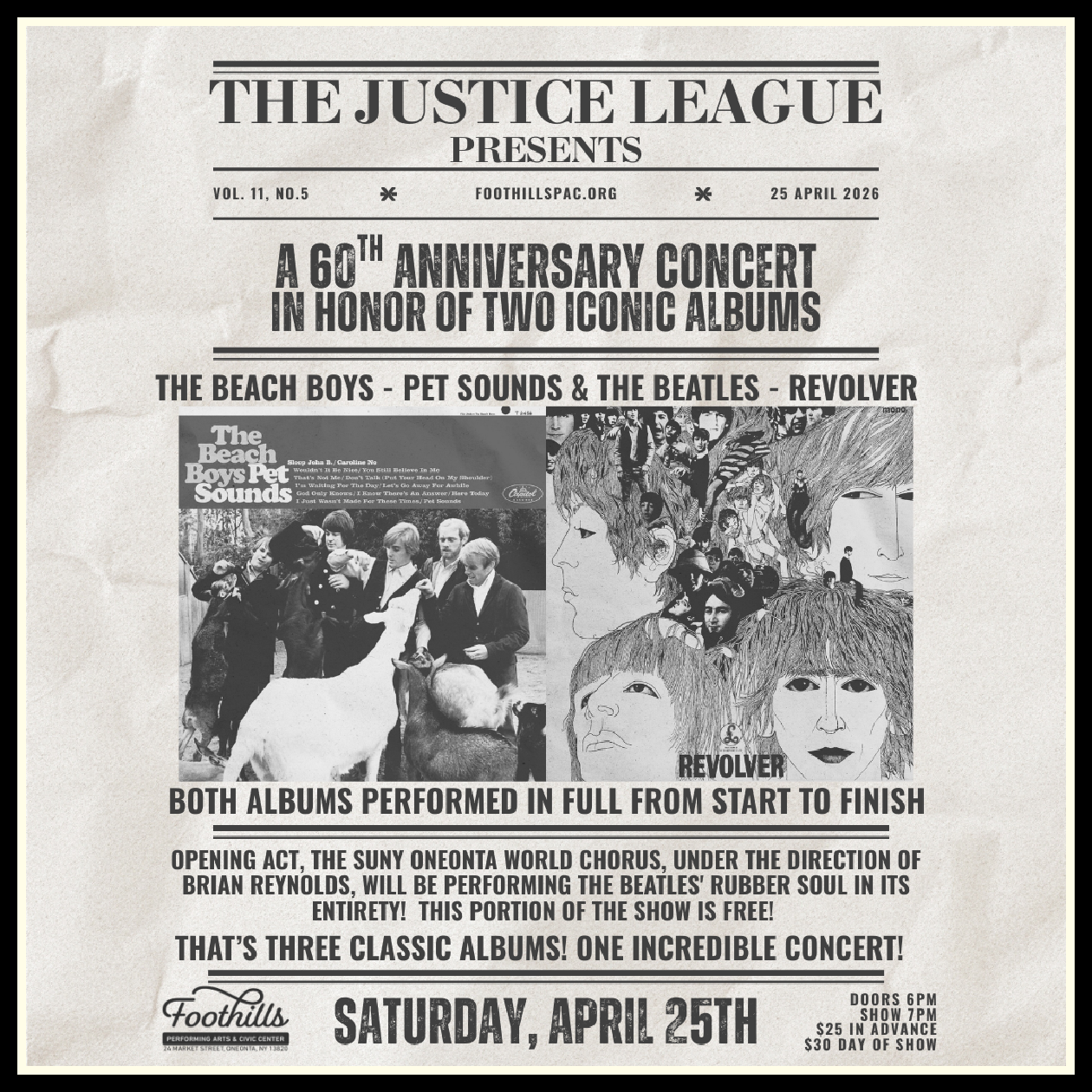 Darcy Gibson and The Justice League will be performing not one, BUT TWO iconic albums that both turn 60 years old in 2026. They are, of course, “Pet Sounds” by The Beach Boys, and “Revolver” by The Beatles. Opening act, The SUNY Oneonta World Chorus, will perform The Beatles’ “Rubber Soul” to start the show!