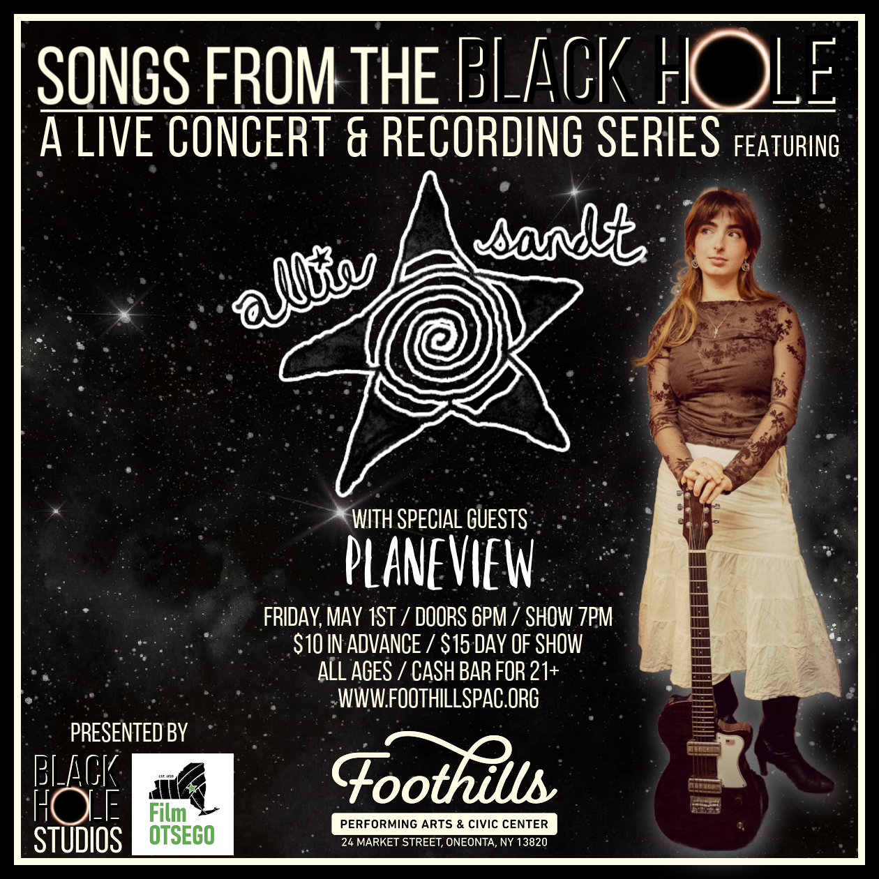 Allie Sandt will be performing and filming a music video as the first featured performer in the “Songs From the Black Hole” series. Join us for the show and have a chance to be in Allie’s music video! Special guests Planeview will open the show at 7pm!